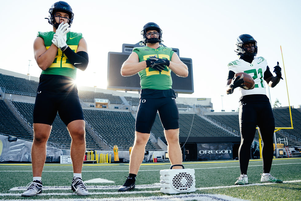 When the Oregon Ducks prepared for one of the loudest atmospheres in all of college football, Penn State’s infamous White Out, they prepped with more than practice. They added noise. With Turtlebox, the Ducks simulated the deafening sound of 115,000 fans, pushing volume to stadium levels and training to thrive in pure chaos. Photo by: Hayden Dobbins.
